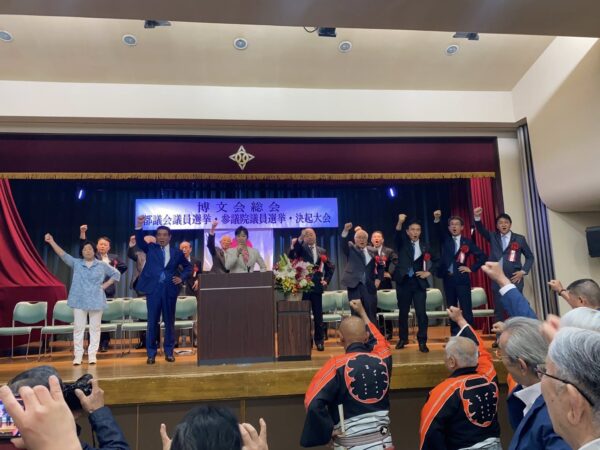 2025年5月28日 / 最終更新日 : 2025年5月28日 サイト管理者 後援会 博文会総会ならびに都議選・参議院選の決起大会 昨日は300人を超える皆様にお越しいただきありがとうございました。会場の椅子が足りずご迷惑をお掛けしました。 博文会総会ならびに都議選・参議院選の決起大会を、無事終えることができました。参考人招致を経ての開催となりましたが、この場をお借りして、改めて皆様にお詫びと感謝の気持ちを直接お伝えできたこと、深く感謝申し上げます。 いよいよ始まる選挙戦、皆様と力を合わせて全力で臨んでまいります。
